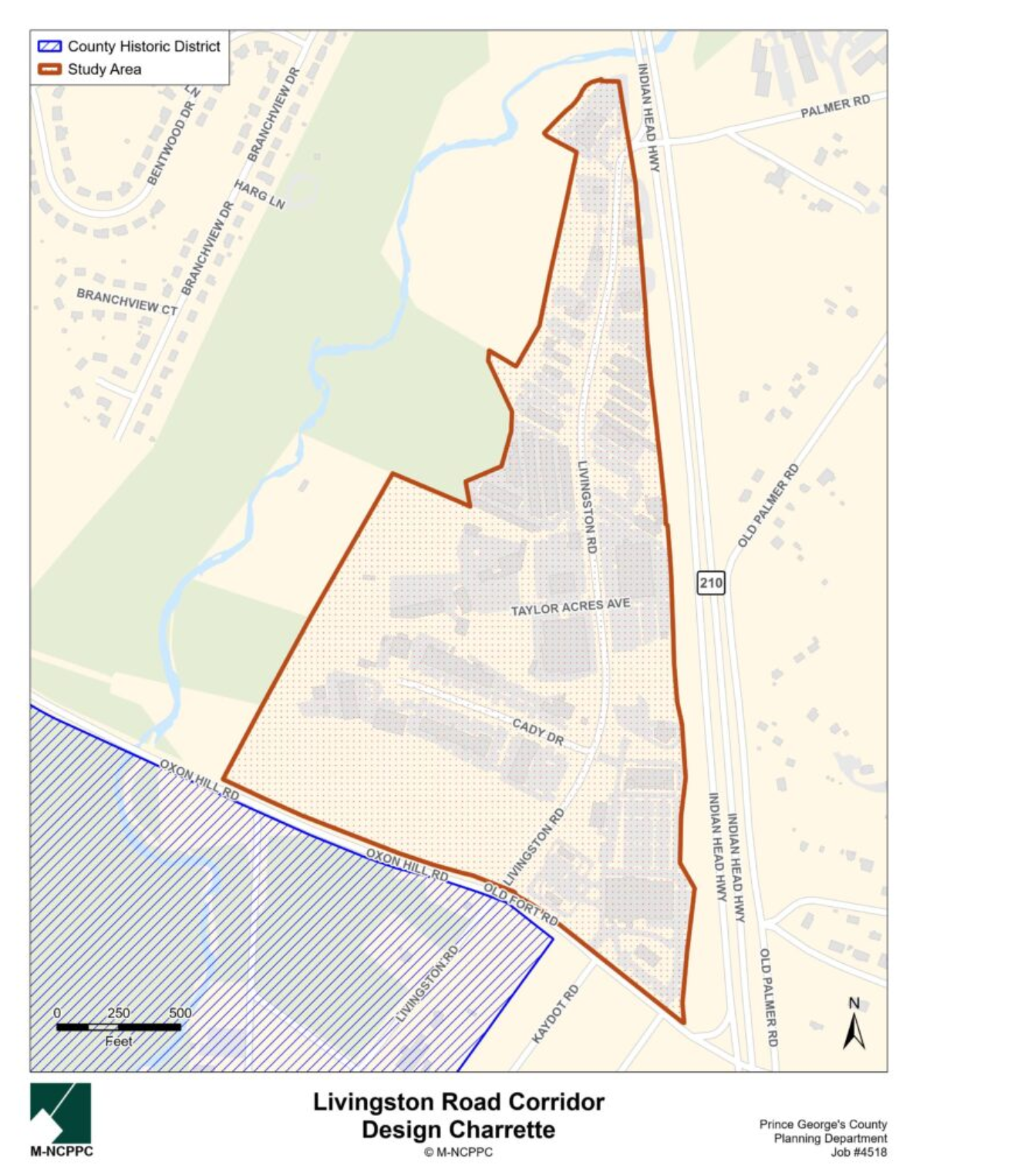 A design charrette for the commercial corridor in Fort Washington along Livingston Road is being conducted. The study area runs along Livingston Road, west of MD 210 at Palmer Road, and is bounded to the south by Old Fort Road and Oxon Hill Road. This stretch of road is the entryway to the Broad Creek Historic District, which is located along Livingston Road, just south of the Old Fort and Oxon Hill Road intersection. Currently, this entryway does not provide an orientation that prepares residents or visitors to the historic district. The Broad Creek Historic District is listed in the National Register of Historic Places and is a local historic district in Prince George’s County, subject to the Prince George’s County Historic Preservation Ordinance (Subtitle 29).