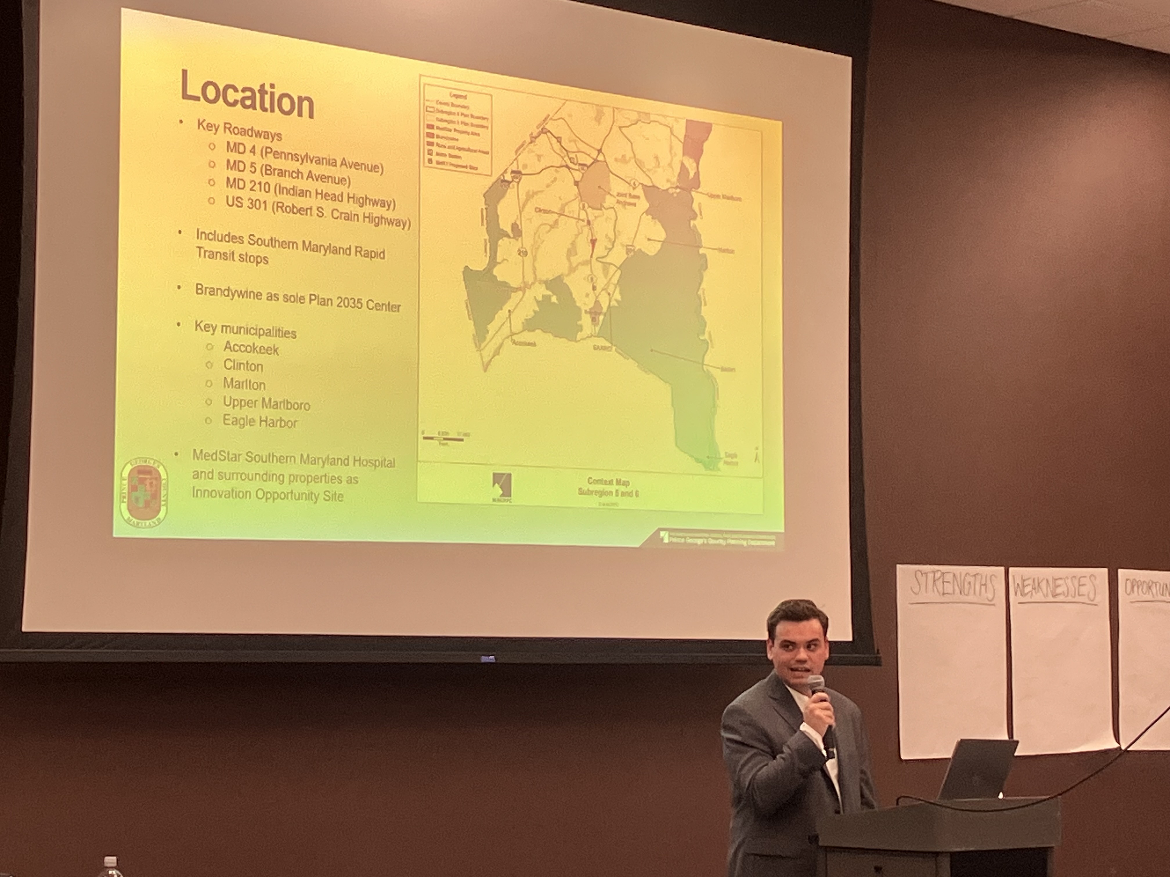 The Prince George’s County Planning Department, in conjunction with the Office of the Honorable Sydney J. Harrison, Vice Chair of the Prince George’s County Council, held a work session for Council District 9 (Planning Subregions 5 and 6) at the Southern Area Aquatics and Recreation Complex. The project team discussed the most recent planning history of Subregions 5 and 6 and the benefits of a medical innovation campus, using examples of medical innovation districts nationwide. Attendees were asked to provide input on what they believed were the strengths, weaknesses, opportunities, and threats pertaining to District 9 and also to the feasibility of the development of a medical innovation campus around the MedStar Southern Maryland Hospital on MD 5 (Branch Avenue), in Clinton.